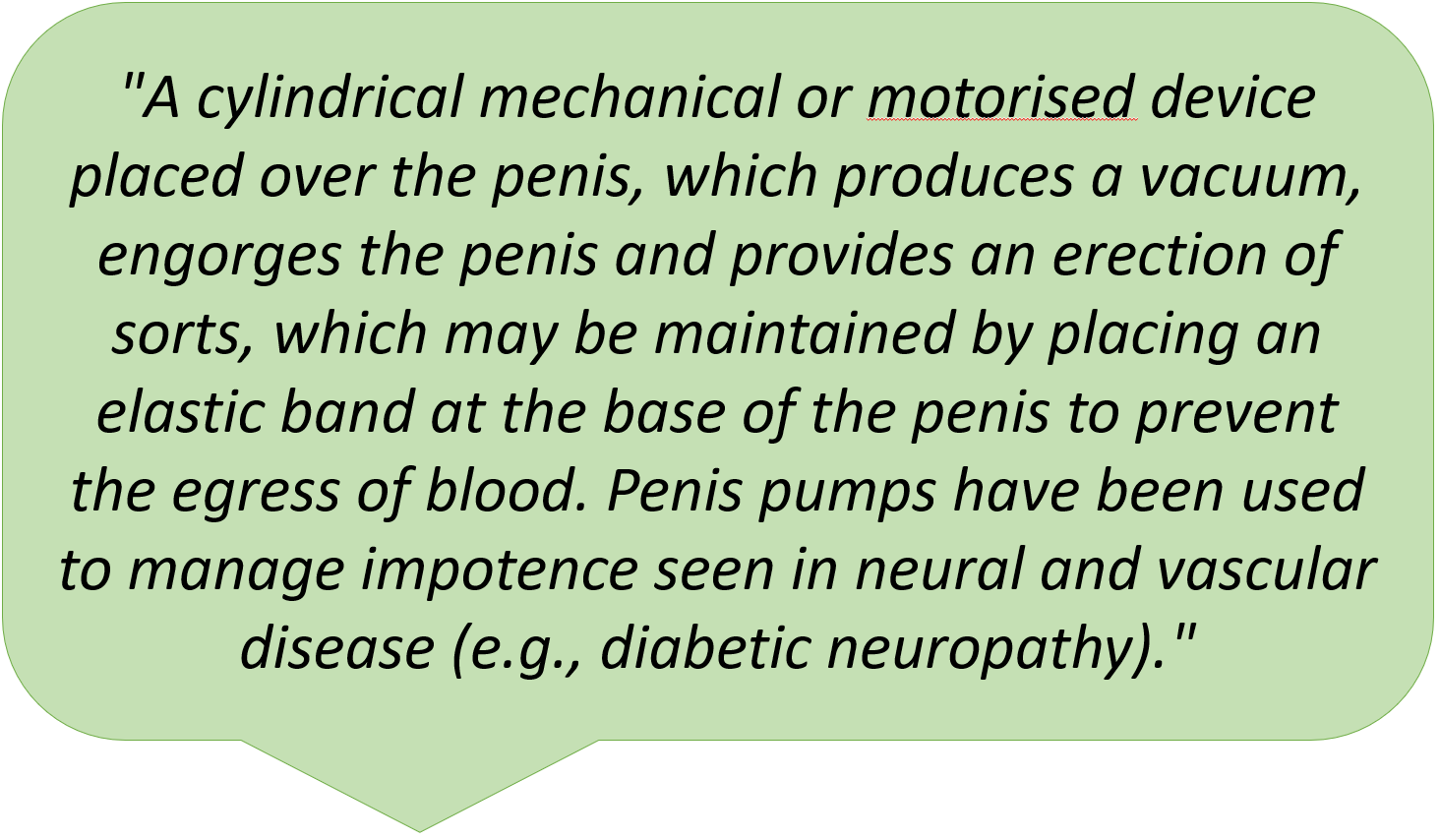 "A cylindrical mechanical or motorised device placed over the penis, which produces a vacuum, engorges the penis and provides an erection of sorts, which may be maintained by placing an elastic band at the base of the penis to prevent the egress of blood. Penis pumps have been used to manage impotence seen in neural and vascular disease (e.g., diabetic neuropathy)."